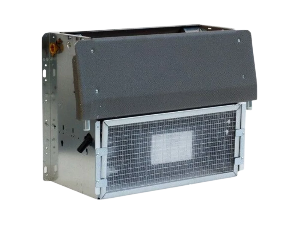 Alap fan-coil, 2 csöves rendszerhez, 3 fokozatú motorral, szabályzó nélkül, alacsony magasságú parapet / mennyezeti kialakítással, így függőlegesen és vízszintesen is szerelhető. Burkolat nélküli készülék hőszigetelt horganyzott acél kivitelben, front beszívással.